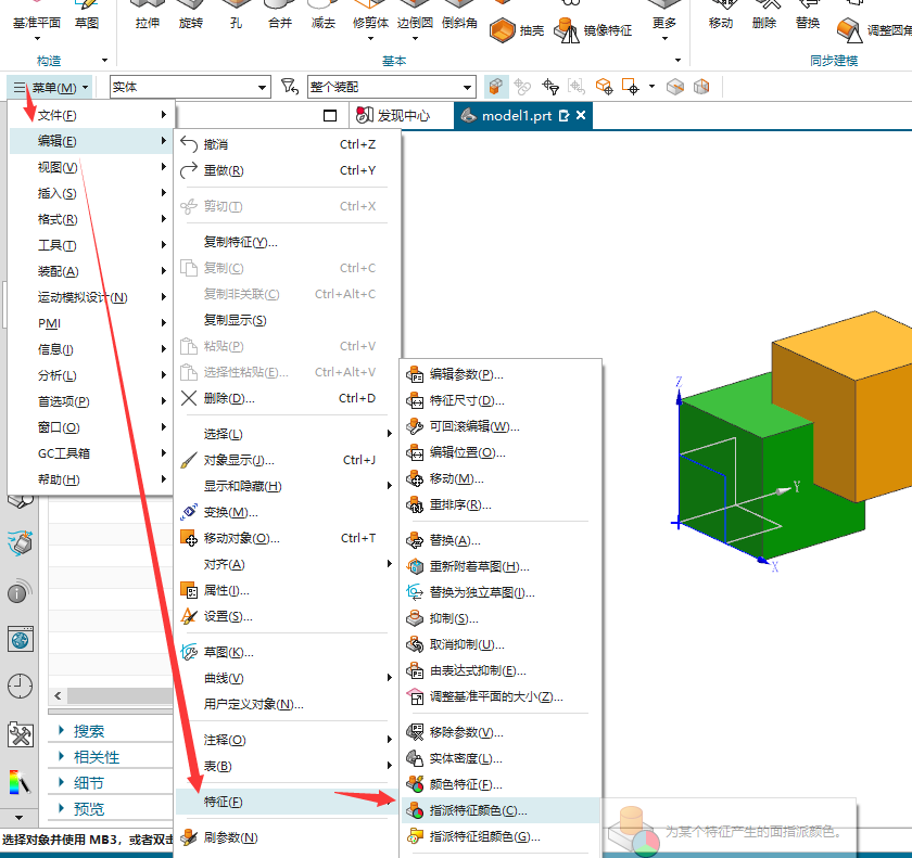 NX10.0 (NX2406相同)操作:菜单/编辑/特征/指派特征颜色。
