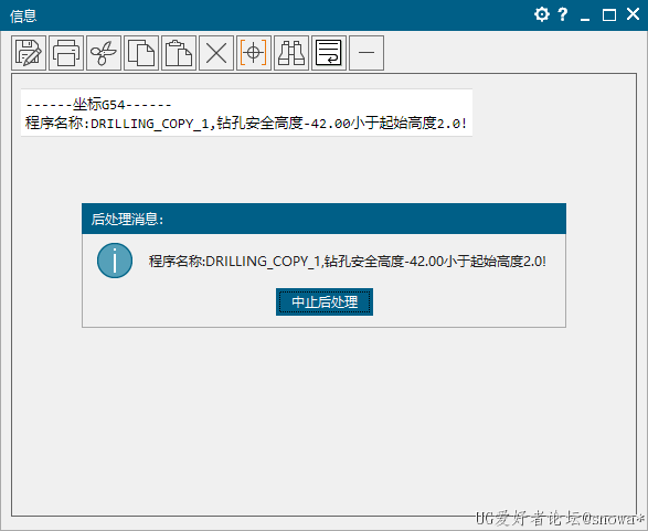 set msg [MOM_display_message 程序名称:$mom_operation_name,钻孔安全高度$zz小于起始高度$mom_cycle_rapid_to_pos(2)! 后处理消息:I 中止后处理]