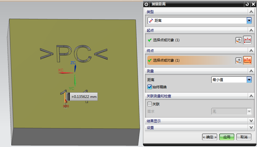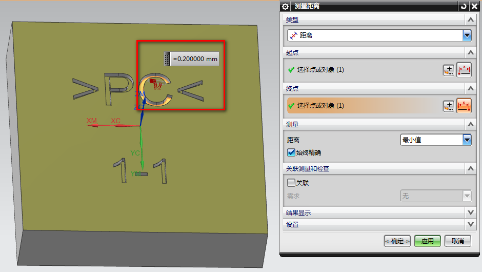 2、测量距离为0.13MM左右,只要是大于此宽度的刀具都无法进去,我们只有使用D0.1的刀具:
