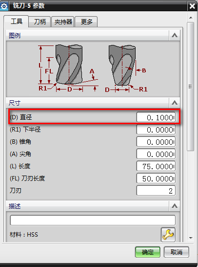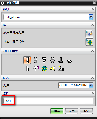 3、创建刀具,D0.1,输入直径为0.1MM: