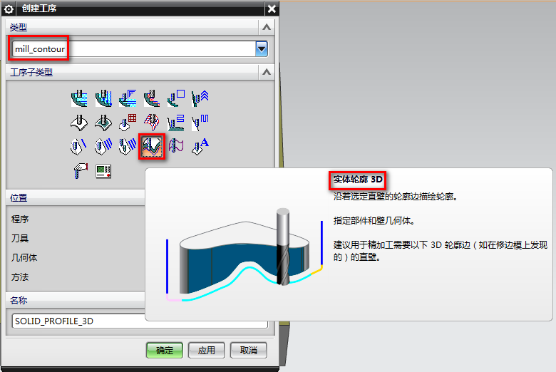 4、创建工序-mill_contour,选择实体轮廓3D工序: