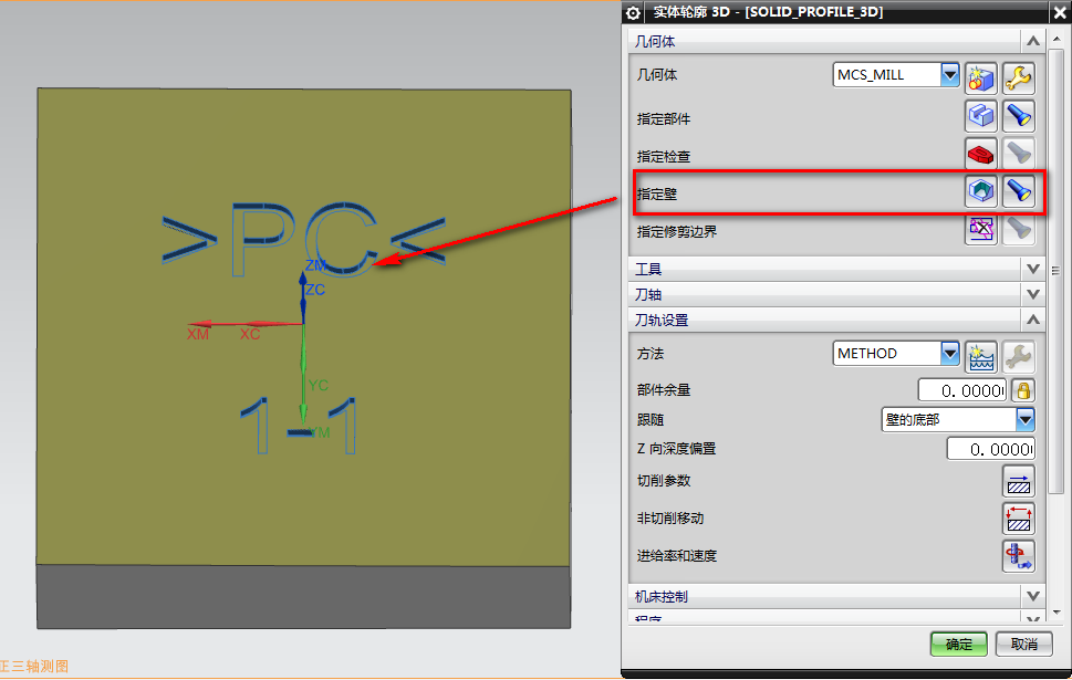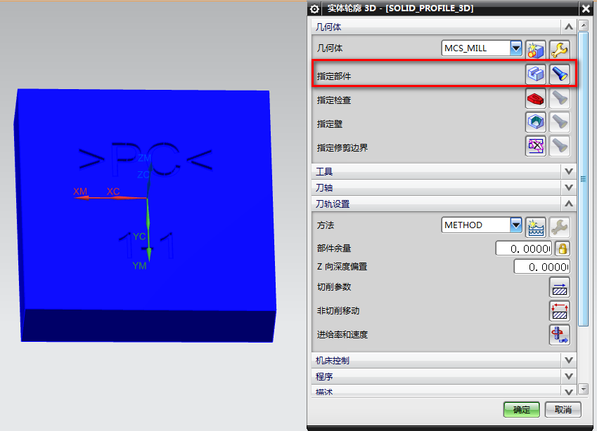 5、在工序界面,指定部件选择要加工的实体: