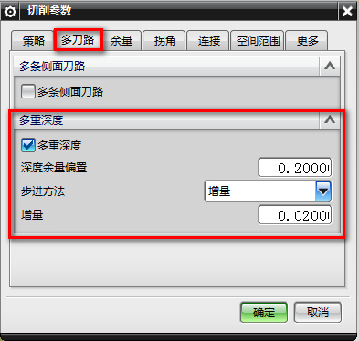 8、切削参数-多刀路-多重深度,深度余量偏置0.2MM,增量0.02MM: