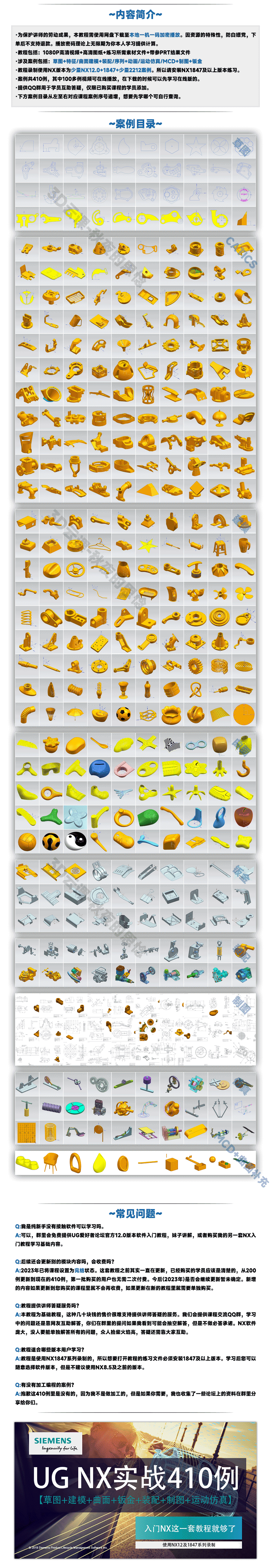 案例包括草图+特征建模+曲面+钣金+工程图+装配+运动仿真