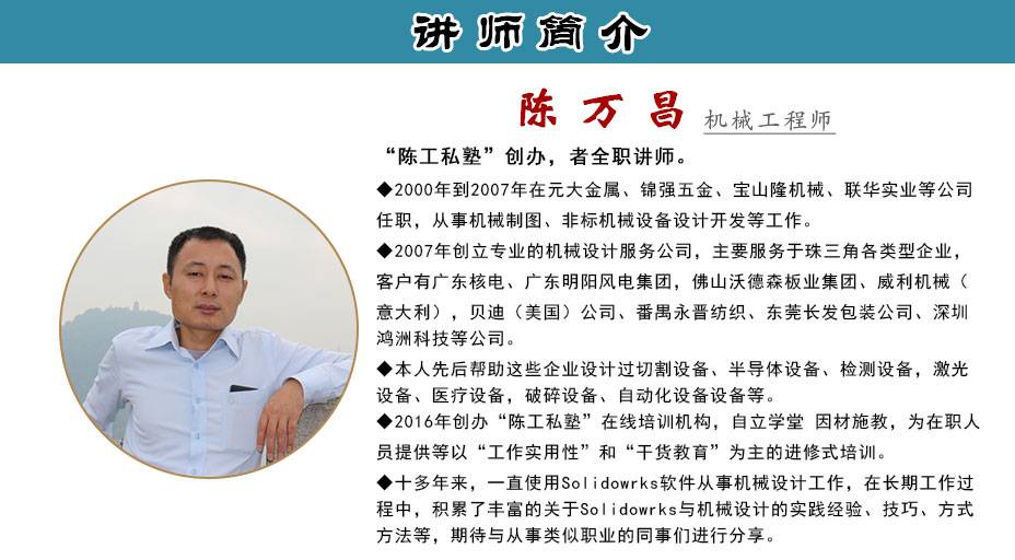本课程由陈工亲自讲解和亲自规划的超实战实性课程,通篇贯彻陈工的“工作实用性”和“干货教育”的教学理念,向学员们分享和传授最具实用价格的实战性专业技术,全面深入讲解SW零件建模的方方面面。
